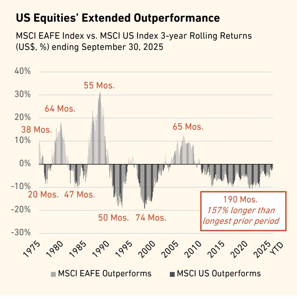 Bar chart comparing MSCI EAFE Index and MSCI US Index 3-year rolling returns from 1975 to September 2025, highlighting a record 190-month period of US equities’ outperformance, 157% longer than the previous longest period.